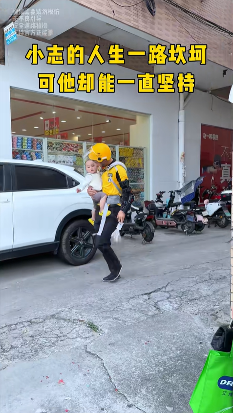 小智只有一只手臂能正常用力,身體的殘缺讓他連騎電動車都做不到,更別說背著孩子安全騎行。為了賺錢養活自己和襁褓中的兒子,他只能選擇最笨、最累的方式 ——全程跑步送外賣。滾燙的路面烤著腳底,厚重的外賣箱壓在肩頭,懷里的孩子睡得不安穩,時不時哼唧兩聲,小智只能一邊穩住步伐,一邊用僅有的一只手輕輕拍哄,每一步都走得艱難又堅定。