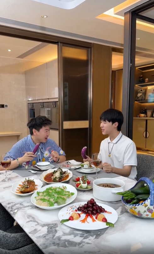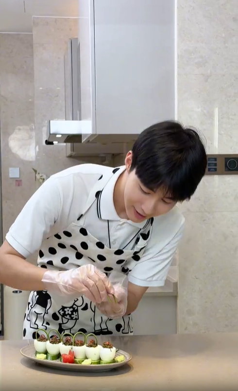 凱凱還準備了涼拌香椿鹵牛肉,把燙熟的香椿菜切粒、鹵牛肉切丁,倒入調料后潑上熱油。另一邊,唐老板在收拾小凱留下的痕跡:“這個小凱還踩過凱凱拖鞋,可得好好刷一刷,把他這股虛情假意都好好沖一沖,可別讓凱凱這老實人再沾上,以后這就是凱凱的專屬領地。”凱凱又做了五花肉洋蔥圈,用五花肉纏上洋蔥小火慢煎至金黃,放進料汁后擺成中國如意結的造型:“如意如意,接下來全都是如意。”