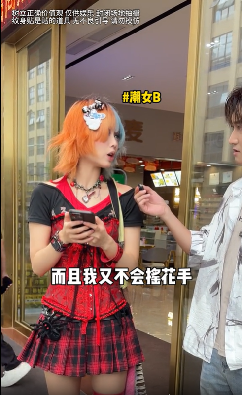 挑戰一開始,我先問身邊的女生:“你可以裝精神小妹嗎?”她立刻一臉嫌棄:“不是,你有病吧?我哪里像精神小妹,那么土那么low,不可能的!而且我又不會搖花手,這個我接受不了。”說笑間,參與挑戰的幾個人已經陸續到位,個個都帶著“精神人”的標配氣場。