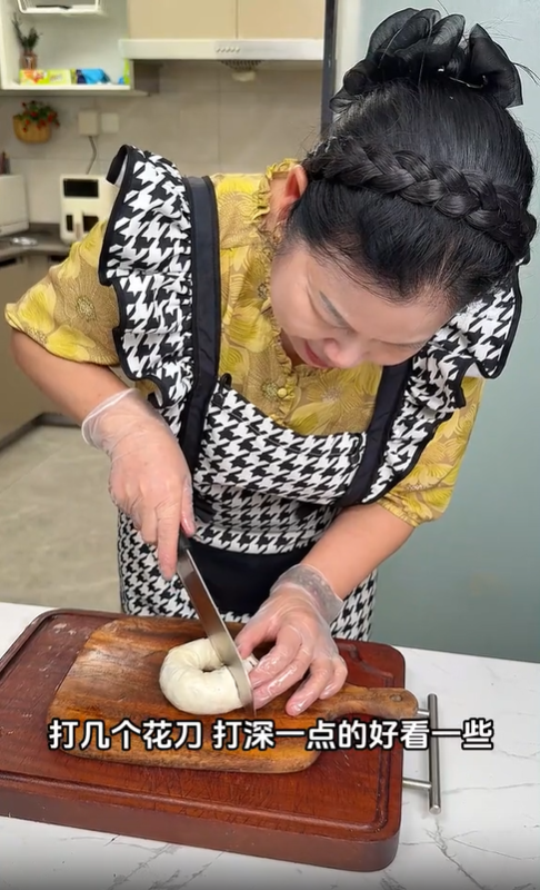 4. 卷制塑形,切花刀更顯顏值:從手抓餅的一端緊緊向內卷起來,卷成一個緊實的長條狀,卷的時候要用力均勻,避免內部留有空氣,導致烤制時鼓包。卷好后,用手將長條的兩端接口處用力捏緊,防止烤制過程中散開。接著用鋒利的菜刀,在卷好的長條上均勻切出花刀,刀要切得深一些,大概到長條厚度的2/3處,但切記不要切斷(切斷會影響造型,也容易露餡),每刀之間間隔約1.5cm,切得均勻一些,烤制后會自然散開,造型更像甜甜圈。