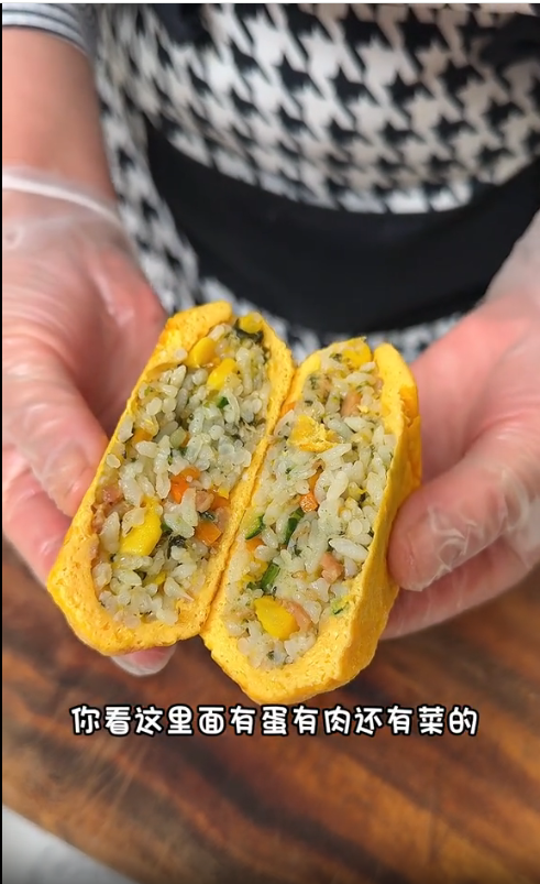 - 煎制時全程用小火,避免大火把蛋液煎糊,同時確保內部的飯團能慢慢熟透;如果用普通平底鍋,一次可以煎2個,避免擁擠導致蛋皮破損。