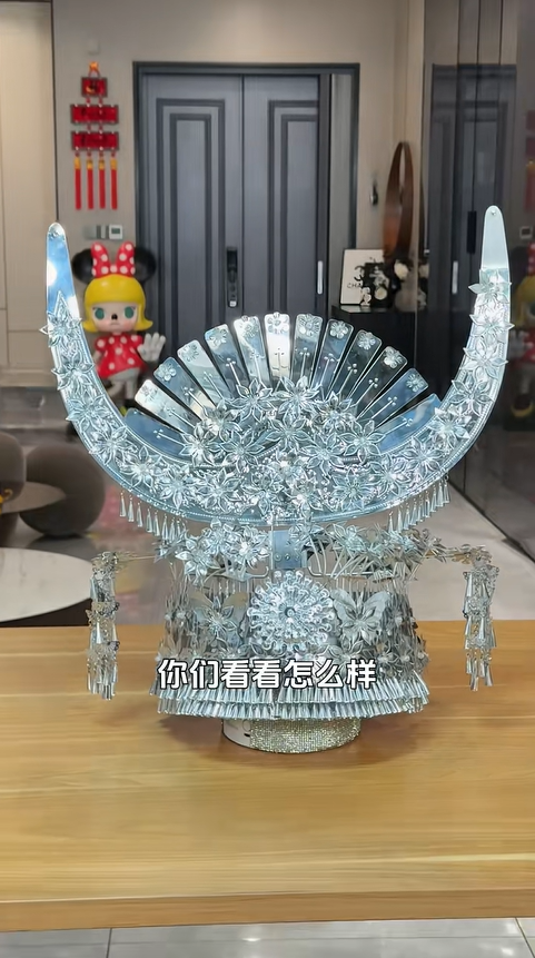 第二天傍晚,當佳怡捧著做好的頭飾走到我面前時,我徹底被驚艷到了。牛角冠弧度優美,上面綴滿了層層疊疊的小花,花間掛著小巧的響鈴,兩側的蝴蝶仿佛停在花叢中,陽光灑在上面,布靈布靈的,比我去年在苗寨戴的頭飾還要精致好看。“楊姐,你看喜歡嗎?” 佳怡的眼底帶著一絲忐忑,還有掩飾不住的期待。