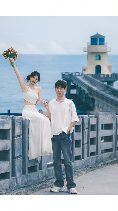換好衣服后,他倆站在一起,男神女神的搭配簡直配一臉!我帶著他們直奔南澳島有名的錢澳灣燈塔,遠遠望去,白色的燈塔矗立在海邊,與湛藍的海水、金黃的沙灘構成一幅絕美的畫卷。對接好的攝影師早已等候在此,當我告訴佳怡和小海 “今天的任務就是給你們拍海邊情侶寫真” 時,他倆又驚又喜,佳怡連忙說:“楊楊姐,應該我們倆給你拍才對呀!” 我笑著擺擺手:“我看著你們去年 1 月份在杭州第一次見面,從一開始的拘謹陌生,到后來慢慢心動依賴,這些美好都該被好好記錄下來。”
