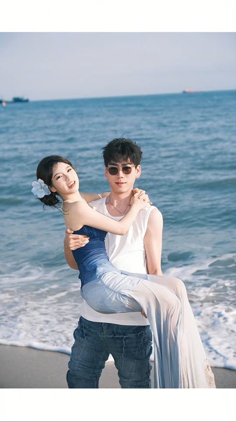 我給他們選的第二套衣服,和海邊的景色簡直是絕配,淺色系的穿搭襯得兩人愈發清爽亮眼。我不斷鼓勵他們:“放開點,就是各種抱就完了,今天一定要拍出你們的人生照片!” 看著小海小心翼翼護著佳怡,佳怡滿眼依賴地望著小海,那種被疼愛的模樣,讓我想起佳怡剛來我家時,還是個怯生生的小姑娘,如今找到了能呵護她的人,這份幸福真的太讓人欣慰了。