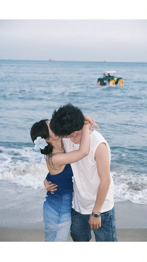 拍照過程中,我全程在一旁 “指揮”:“你們離近點,別藏著掖著呀”“這束花給你們當道具,氛圍感拉滿”“來,小海親美女一口”。當看到他們在鏡頭前自然相擁、甜蜜親吻,海風拂起他們的發絲,陽光灑在他們臉上,那種青春又炙熱的愛意,讓我忍不住連連感嘆 “太有氛圍感了”。