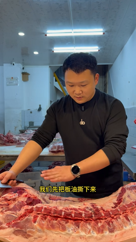 一切準備就緒,正式開始分割。先處理豬的內臟周邊部位,第一步要把板油撕下來,順帶取出豬腰。撕板油的關鍵在于 “快”,動作要一氣呵成,中間絕對不能停頓,一旦停下,板油就會和肉質粘連,再撕就容易撕碎,影響成型,順著板油的紋理快速撕扯,就能完整取下。