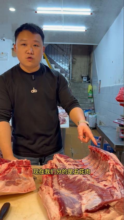 然后分割五花肉,五花肉和排骨之間有脆骨作為連接點,這就是分割的關鍵,找準脆骨的位置,用刀用力按下去,這里需要稍用巧勁,順著脆骨的紋理切割,就能把五花肉和排骨完美分離,排骨也能保持完整的成型,賣相更美觀。分離后的五花肉,我們日常售賣常做精五花處理,把五花肉中間多余的雜肉剔除,只保留層次分明的精五花部分,這樣的五花肉無論是煎烤還是燉煮,口感都更好。
